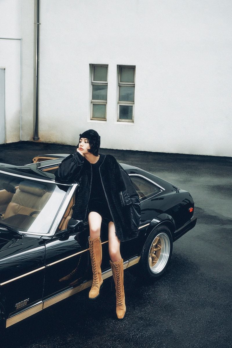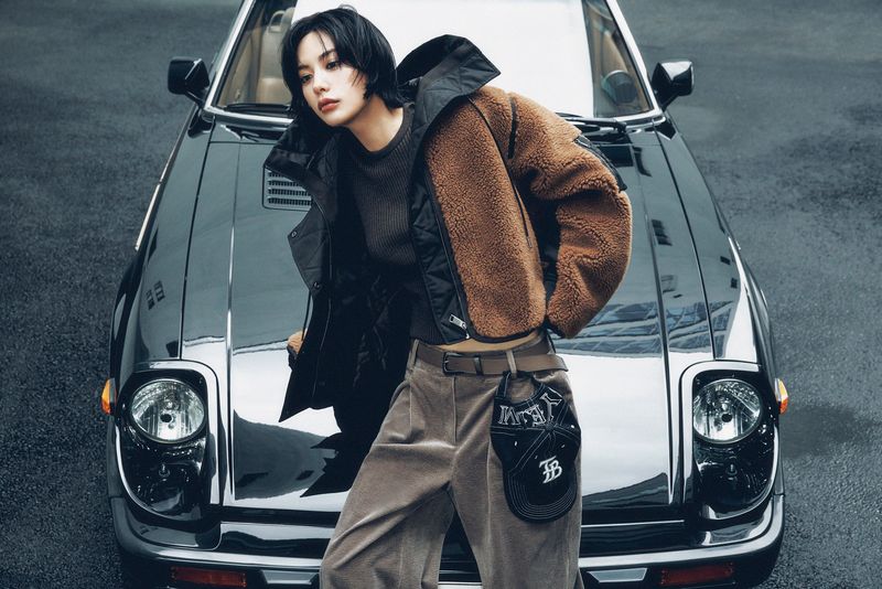 브라운 니트와 니트 팬츠에 블랙 무스탕을 더한 스타일링은 클래식 카와 조명이 만들어내는 무드 속에서 더욱 드라마틱하게 돋보였다. 또한, 럭셔리한 에코 퍼 소재 재킷에 니트 비니와 브라운 부츠를 매치한 룩에서는 트렌디한 매력을 드러내기도 했다.