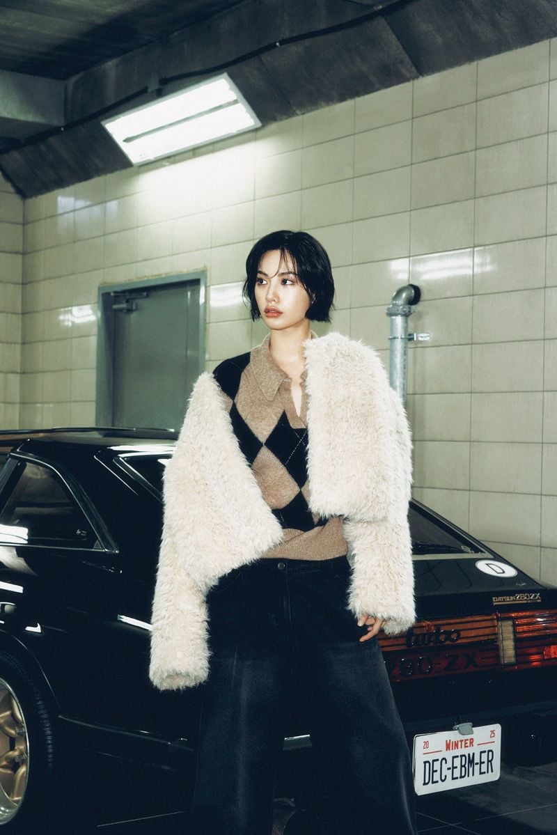 이외에도 아가일 니트 스웨터에 화이트 에코 퍼 재킷을 매치해 고급스러운 실루엣을 강조했다.