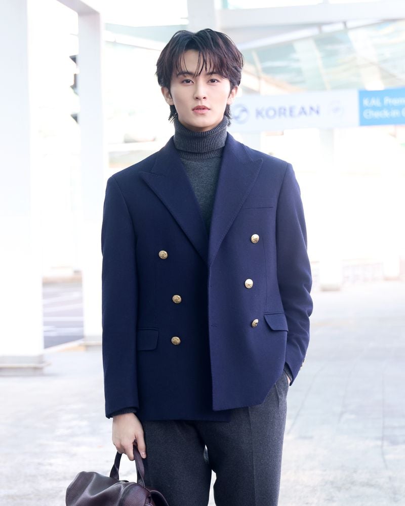 출국에 앞서 마크는 구조적인 울 플란넬 블레이저와 캐시미어 터틀넥 스웨터를 착용해 럭셔리하면서도 클래식한 무드를 연출했다.