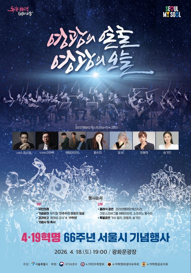 이번 행사는 4.19혁명의 역사적 가치와 민주주의 정신을 계승·발전시키고, 시민들과 그 의미를 되새기기 위해 마련됐다. 정동하와 알리를 비롯해 코리안챔버오케스트라, 레떼아모르, 황수미, 송가인 등 다양한 아티스트들이 참여한다.