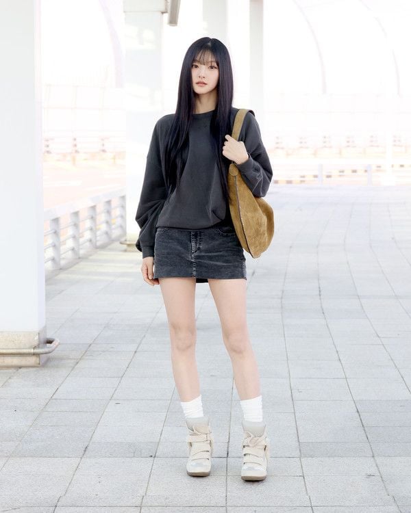 레이스 디테일이 돋보이는 샴페인 컬러의 블라우스에 테이퍼드 핏 데님 팬츠를 매치해 멋스러운 분위기를 자아냈고, 하늘은 워싱 스웨트셔츠에 미니멀한 블랙 코듀로이 스커트를 더해 세련된 무드를 선보인 모습이다.