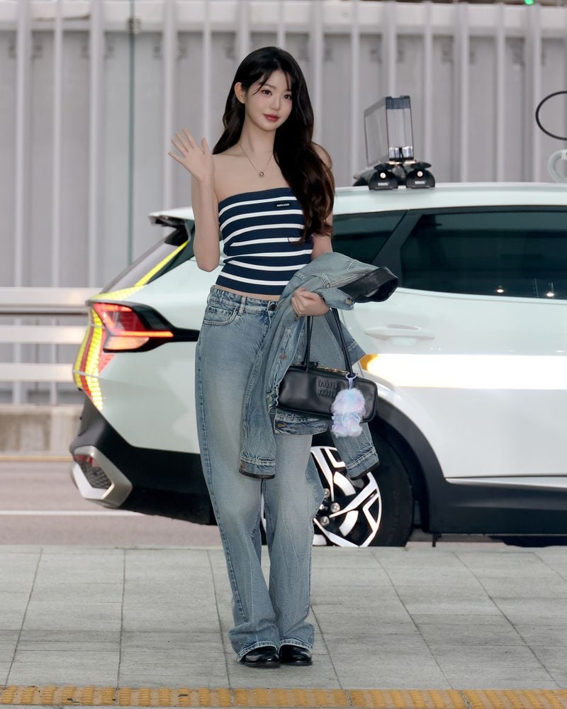 장원영은 스트라이프 튜브 탑에 라이트 블루 컬러의 데님 블루종 재킷과 클래식 핏 데님 팬츠를 착용해 그녀만의 유니크한 셋업 룩을 연출했다.